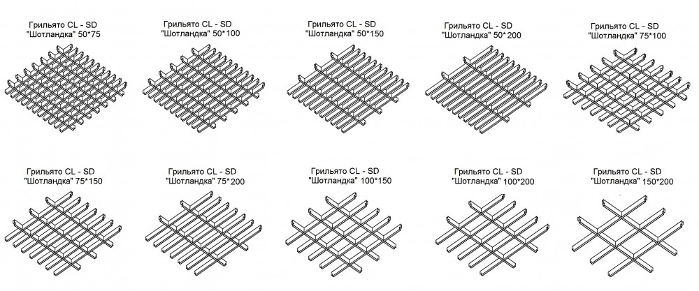 Система CL-SD «Шотландка» представляет собой одинаковые по размеру прямоугольные ячейки что помогает подчеркнуть индивидуальность любого помещения. Подвесная система для этого потолка представляет собой U-образный алюминиевый профиль. Ячейки на профиле могут быть разного размера. В зависимости от размеров ячеек можно добиться разного вида дизайна. Например, для помещений с высокими потолками следует выбирать потолки с большими размерами ячеек. Для низких потолков будет идеальной мелкая решетка.